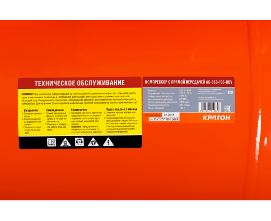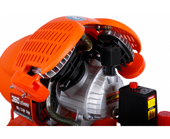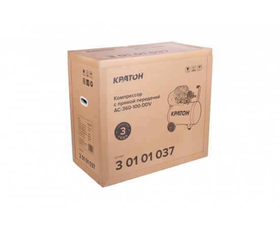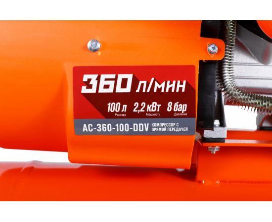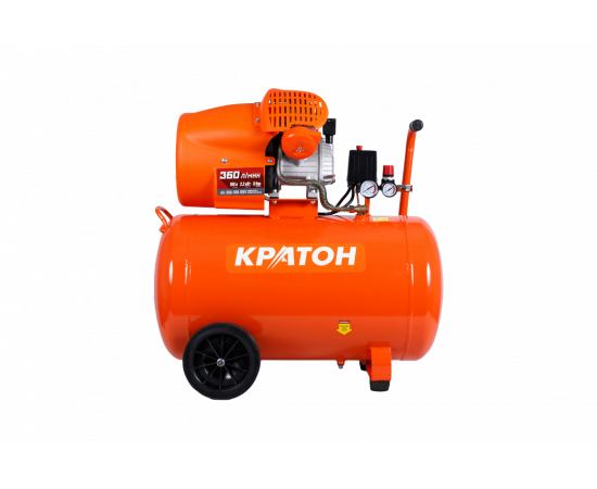 Компрессор масляный, марки Кратон AC-360-100-DDV, с прямой передачей, предназначен для нагнетания и перемещения сжатого воздуха при использовании с пневмоинструментами. Двухцилиндровая модель оснащена встроенной защитой от перегрева двигателя и предохранительным клапаном, через который происходит стравливание излишнего давления при перегрузке ресивера. Конструкция имеет два колеса и рукоятку для передвижения на небольшие расстояния, а также опоры, гасящие шум и вибрацию. Низкий уровень шума и простота эксплуатации позволяют устанавливать компрессор в небольших помещениях для использования в бытовых целях.